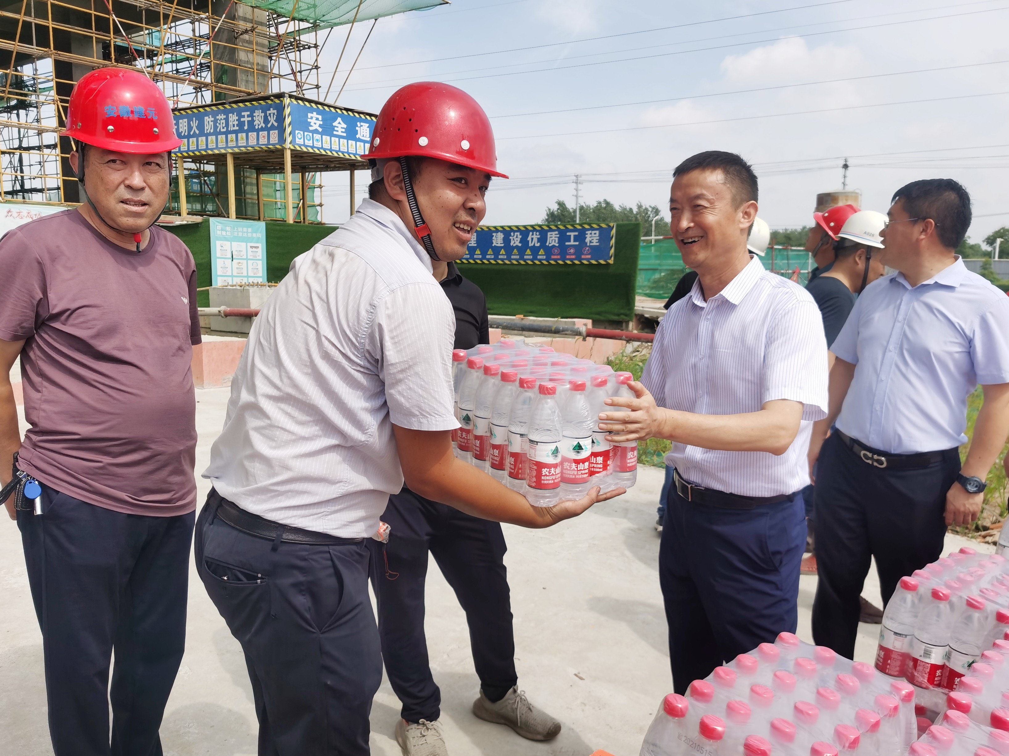 隨著“三伏天”的到來(lái),連日高溫,驕陽(yáng)似火。為做好高溫季節(jié)防暑降溫工作,切實(shí)保障一線員工安全健康地渡過(guò)高溫期,自7月14日以來(lái),集團(tuán)總裁王軍,集團(tuán)黨支部書(shū)記、安全生產(chǎn)領(lǐng)導(dǎo)小組常務(wù)副組長(zhǎng)戴正春等一行分別深入肥東、宣城、全椒、樅陽(yáng)各項(xiàng)目公司、瑞康物業(yè)公司以及琪瑞飲服公司,開(kāi)展“送清涼、暖人心”慰問(wèn)活動(dòng),親切看望慰問(wèn)奮戰(zhàn)在一線的集團(tuán)員工,把集團(tuán)的關(guān)懷送到員工心坎上。