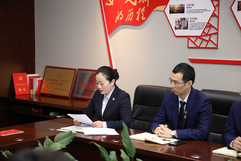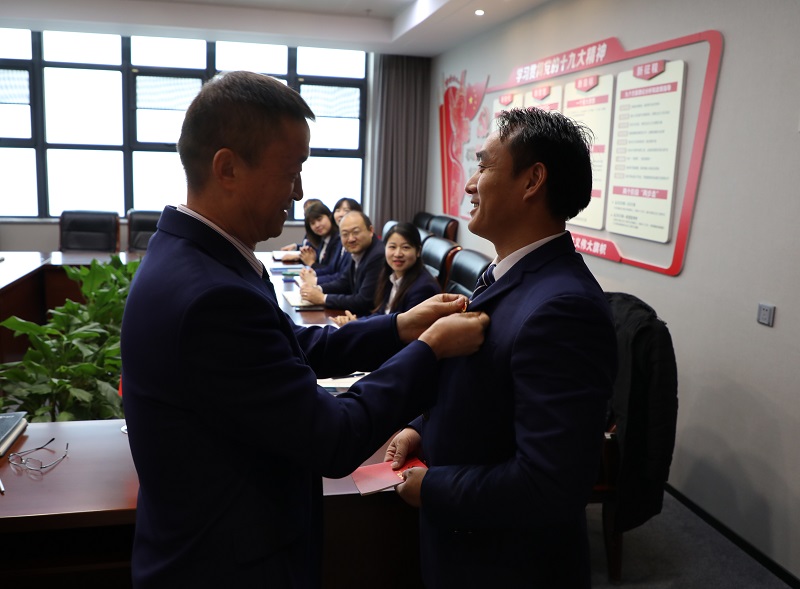 支部書記戴正春為兩名新發(fā)展黨員頒授黨章并佩戴黨徽。