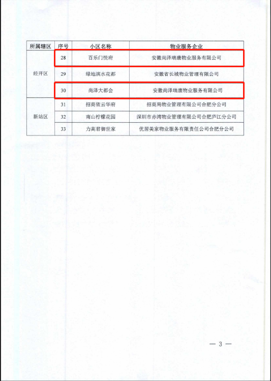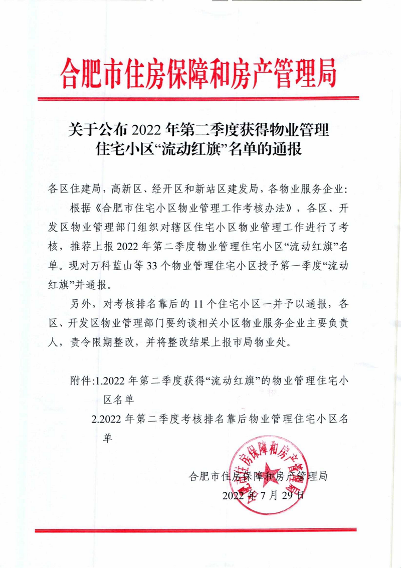 2022年7月29日,尚澤瑞康物業(yè)公司大都會(huì)、百樂門雙項(xiàng)目通過2022年第二季度物業(yè)服務(wù)綜合測評(píng),被授予合肥市物業(yè)管理住宅小區(qū)第二季度“流動(dòng)紅旗”。