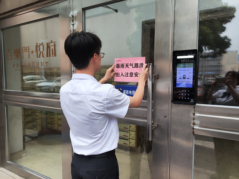 ④24小時守護:各物業(yè)服務中心成立防汛應急工作小組,分級管理,分工明確。嚴格執(zhí)行24小時值班制度,確保信息暢通,妥善應對突發(fā)事件。