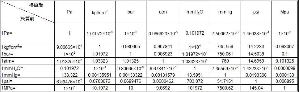 壓力單位轉(zhuǎn)換表
